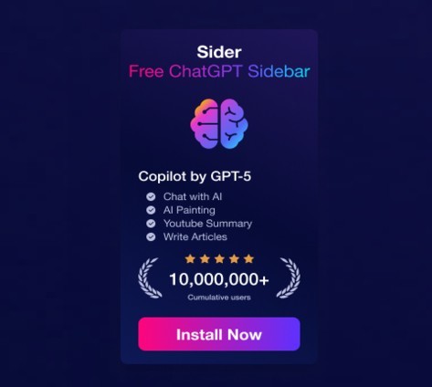 Sider AI has received the Industry Recognitions of 'Top 30 OpenAI partner', the 2025 Chrome Editor’s Pick, has been voted as effective by over 10M million active users, and has a 4.9/5 Trust rating score.
